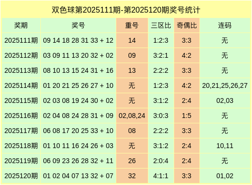 红球三区比为4:1:1,大小比为1:5,奇偶比为3:3,连码开出01,02,重复号码出现1枚32。